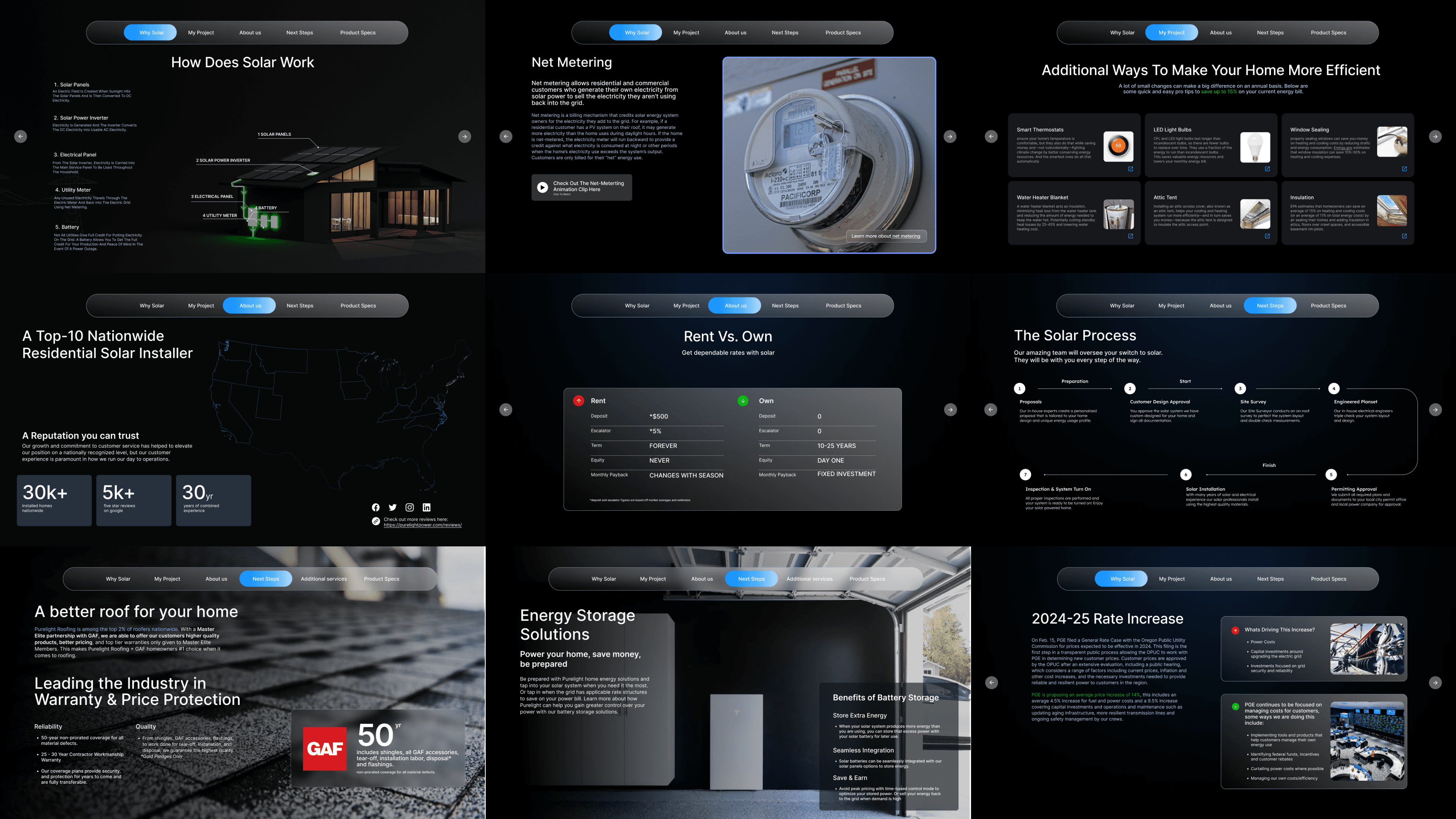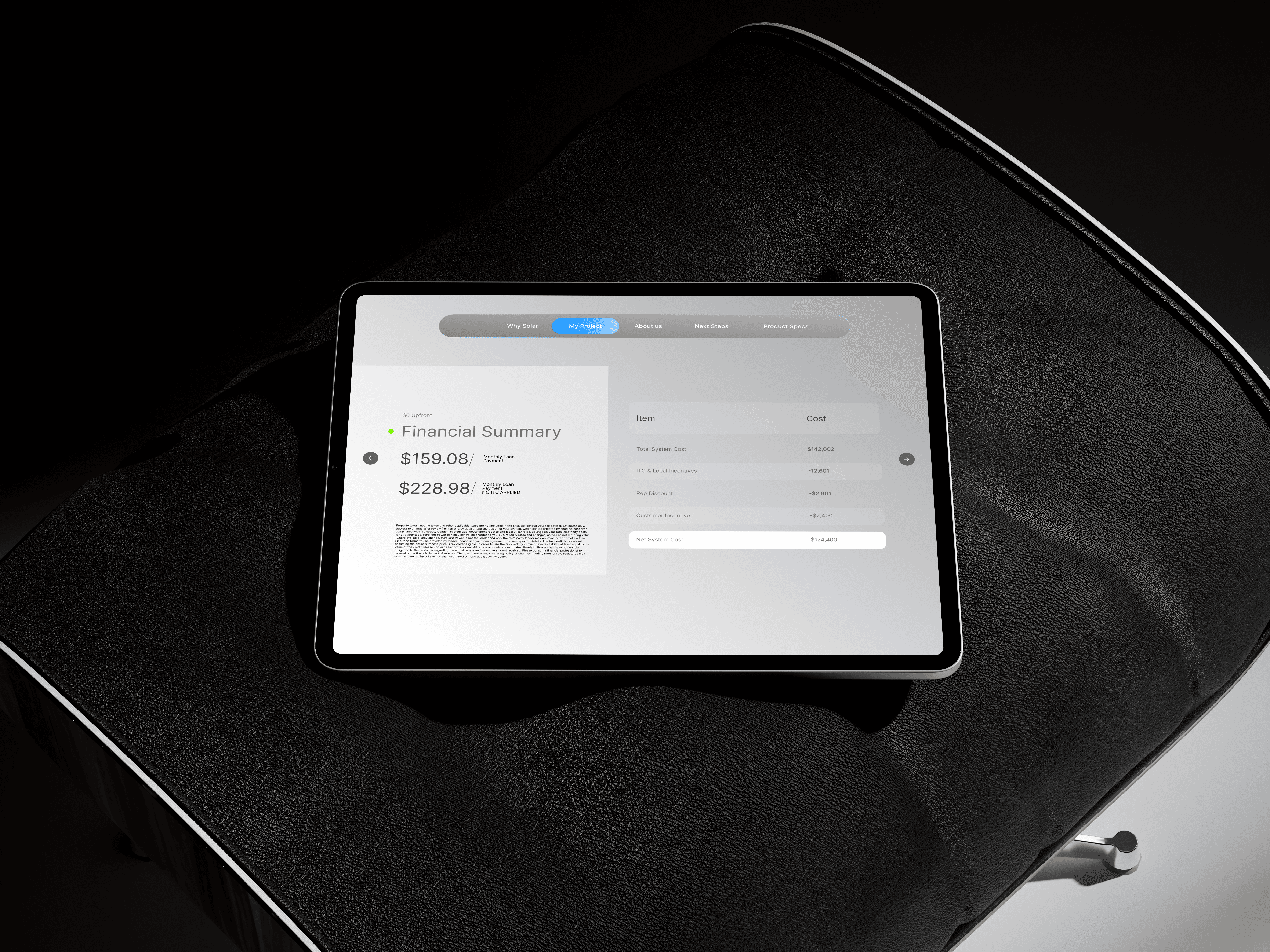Step: Presentation is everything. I used slides as the general paradigm for the tool, optimized for a tablet screen. I worked closely with marketing team to produce dynamic content that clearly communicated a number of complex topics which were typical hurdles on the path to going solar.